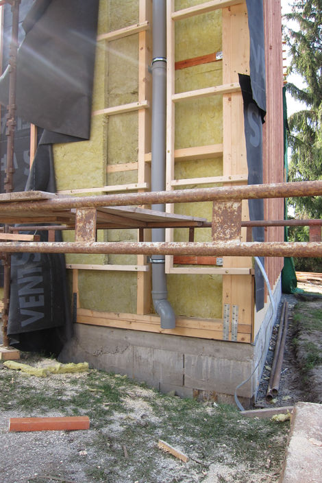 Kompletní obložení celého domu fasádou z modřínu montovanou na nosný rošt. Nad okny jsou vyrobeny kastlíky na předokenní žaluzie.