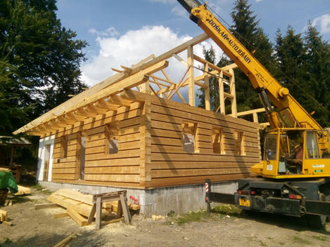 Poloroubenku na Moldavu jsme vyráběli na naší výrobně. Roubení, stropy i krov se vlezou na jedno auto. Na místě už jsme stavbu rychle zkompletovali, sestavili jsme štíty a položili střešní krytinu.
